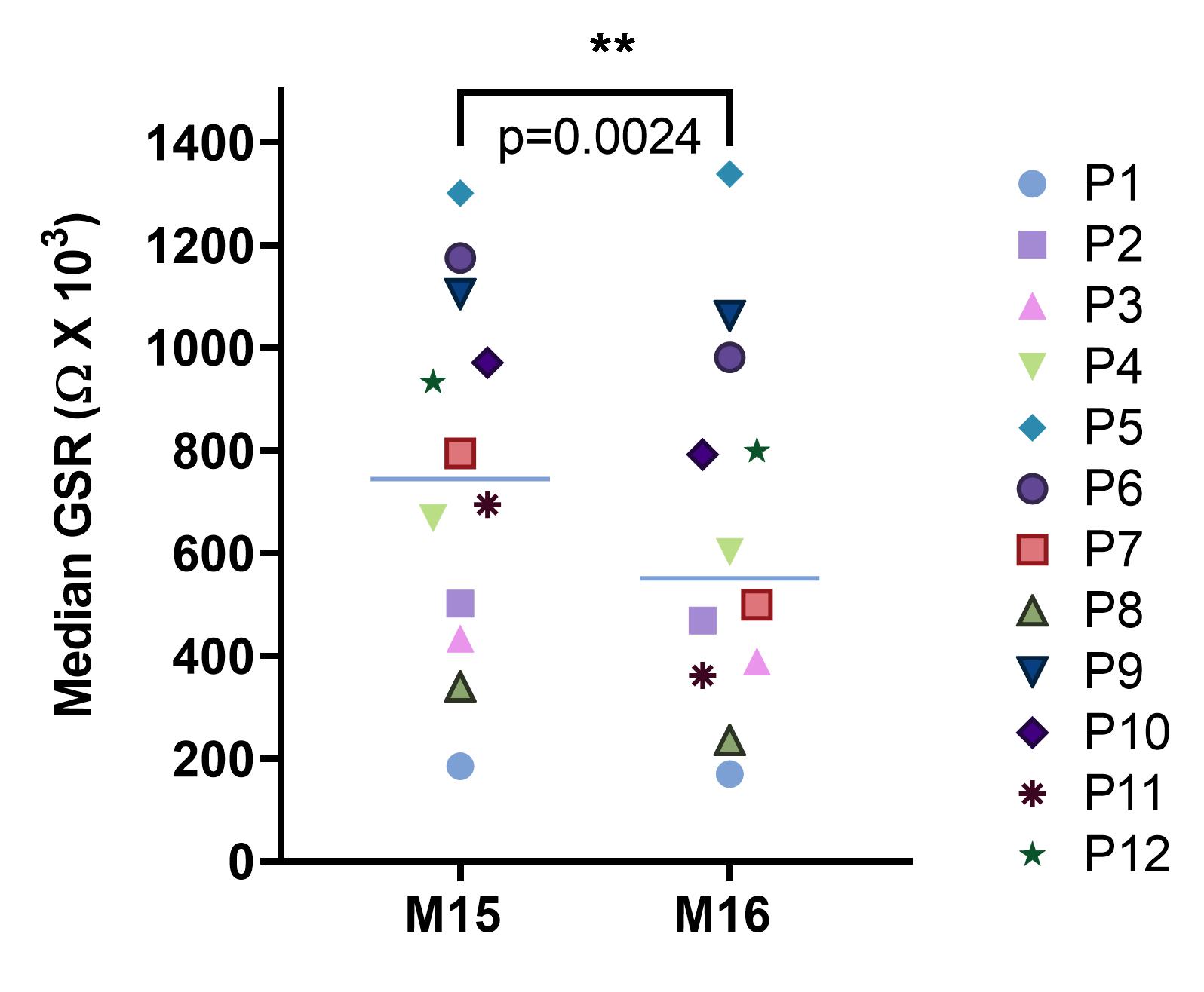 Interestingly, M4-M8 cluster was not significantly different from M11-12 fire ignition cluster (Figure 1A; p=ns), but it was significantly different from M16 cluster (p=0.0028; Figure 2A) when Gayatri Mantra sacrifice started. Hence to find out exactly when in later half of Yagya, GSR values significantly dropped compared to its respective previous session, comparison between M10 (previous step of fire ignition) and M11 (fire ignition) and between M15 (previous session of Gayatri Mantra sacrifice) and M16 (Gayatri Mantra sacrifice) were carried out. GSR signal was unchanged between fire ignition (M11) to its previous step (M10) (p=ns; Figure 2C) (Wilcoxon matched-pairs signed rank test).while it was significantly dropped, during Gayatri Mantra sacrifice (M16) compared to its previous step (M5) (median fold change decrease 1.35; n=12; p=0.0024) (Wilcoxon matched-pairs signed rank test; Figure 2D). This indicated that, during later-half of Yagya ritual, GSR values were low compared to first half of the Yagya ritual and the significant drop in GSR value were at Gayatri Mantra fire offering indicating achievement of the start of the relaxation.