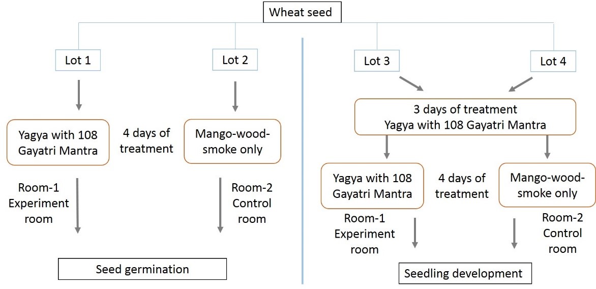 Lot 1 was kept in Yagya room where Yagya with 108 Gayatri Mantra was performed every 24 hours for 4 days, while Lot 2 was kept in the control room where mango-wood-smoke was exposed for the same duration to that of Yagya smoke. Total 8 parameters of the outcome of wheat seed germination were recorded (Table 1).