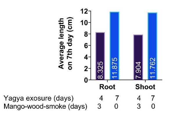 In order to measure the effect of Yagya on the seedling development, Lot 3 and Lot 4 were treated differently. First both the lots were kept in the presence of Yagya for 3 days and then lot 3 was continued for 4 days of further exposure of Yagya treatment and lot 4 was moved to control room where it was exposed to mango-wood-smoke for remaining 4 days of control treatment. Average root and shoot lengths were measured on 7th day (Figure 6). The root and shoot lengths were high in the presence of Yagya compared to that of mango-wood-exposure to the seedling after 3rd day indicating effect of Yagya on already germinated seed for seedling development.
